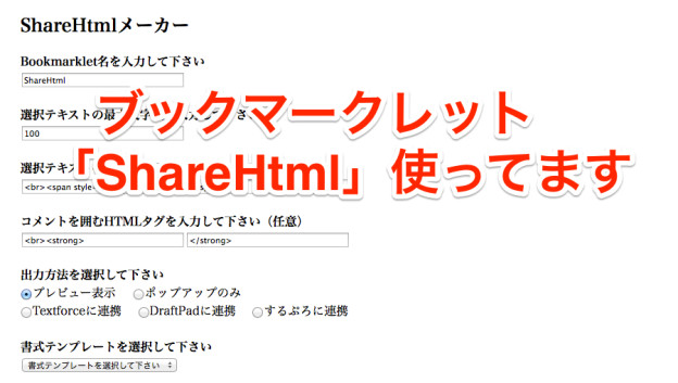 お気に入りのサイトや、参考にさせていただいたサイトをブログで紹介する時に、とんでもなく便利なブックマークレットが「ShareHtml」ですよね。